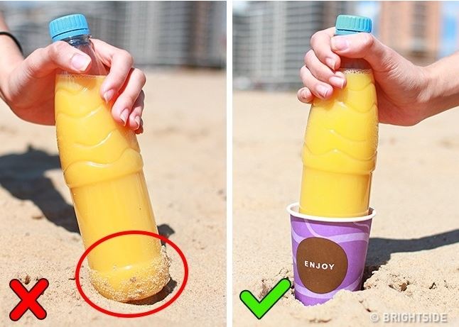 O altă idee pentru ca nisipul cel „băgăreț” să nu ne enerveze câtuși de puțin, este ca sticla de apă sau de suc să nu o punem direct în nisip, ci mai întâi într-un pahar, exact ca în imagine: