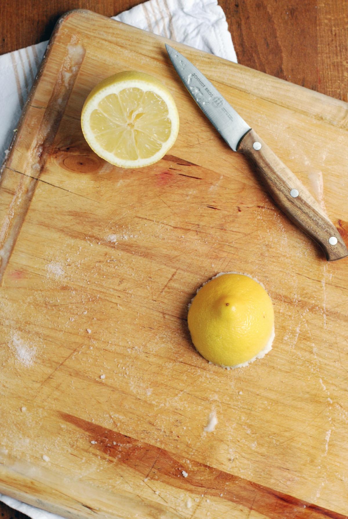 Ai nevoie de o jumătate de lămâie și sare. Aplică o cantitate generoasă de sare pe tocătorul de lemn și apoi folosește jumătate de lămâie pe post de burete pentru a îndepărta reziduurile.