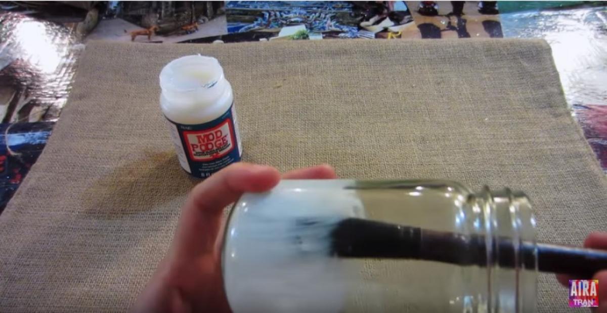 Începe prin a unge interiorul borcanului cu lipici cu ajutorul unei pensule, apoi adaugă sclipiciul şi răsuceşte borcanul astfel încât să aşezi sclipiciul.